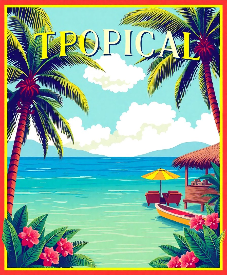 Transform your space with this captivating Vintage Tropical Travel Ad Paint By Numbers kit that brings retro aviation charm to life. This stunning design captures the golden age of travel advertising with vibrant tropical colors and classic poster aesthetics.
