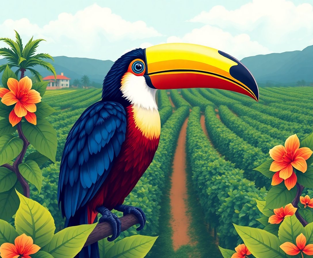 The unique combination of vineyard landscapes with tropical toucan elements creates a distinctive sepia-toned masterpiece. This one-of-a-kind design offers something truly different for your home decor.
