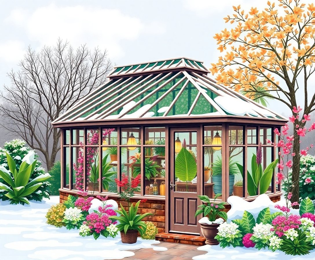 Create your own tropical escape within a winter glasshouse setting. This unique design blends seasonal charm with exotic beauty, resulting in stunning wall art for any room.