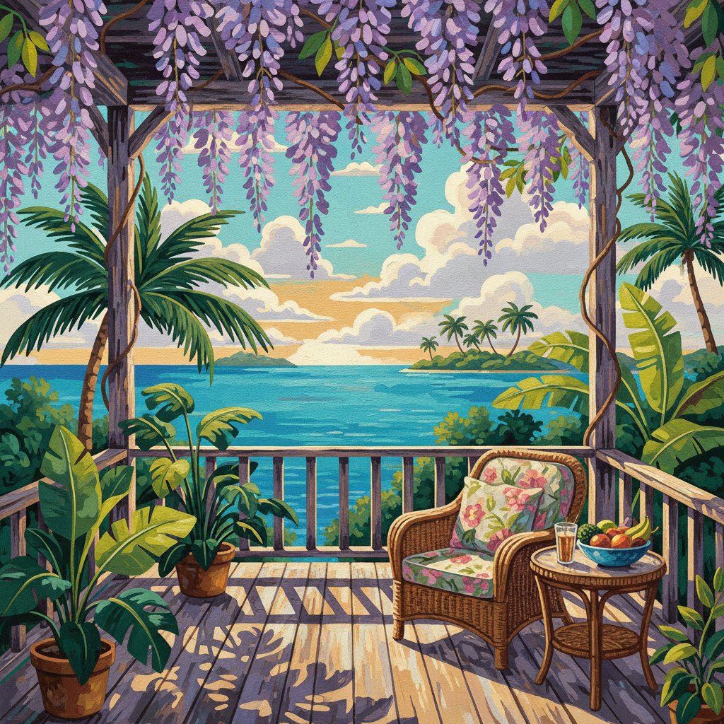 Transform your creative space with this enchanting Vintage Tropical Wisteria Porch Paint By Numbers design. Additionally, this stunning artwork captures the serene beauty of purple wisteria blooms cascading over a charming vintage porch. Moreover, the lush tropical elements create a perfect blend of botanical elegance and nostalgic charm.