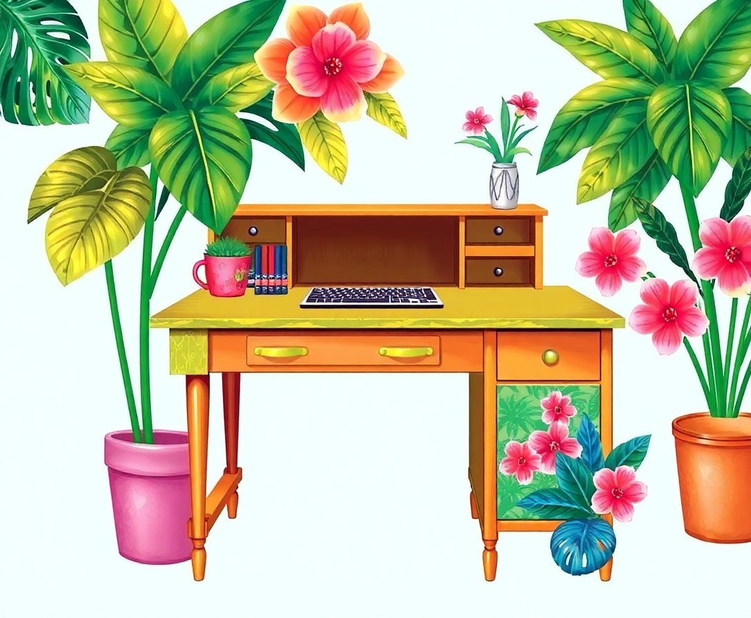 Ultimately, step back and admire your finished creation. The vintage typewriter and tropical ambiance create a stunning focal point. Your cozy indoor space will radiate warmth and nostalgia.