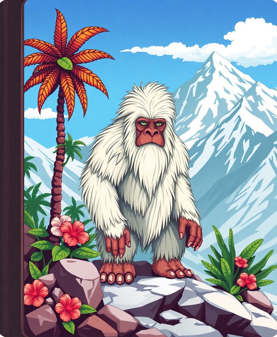 The sepia tones and leather-like textures create an authentic aged appearance. Combined with tropical yeti imagery, it offers a unique mythical adventure theme.
