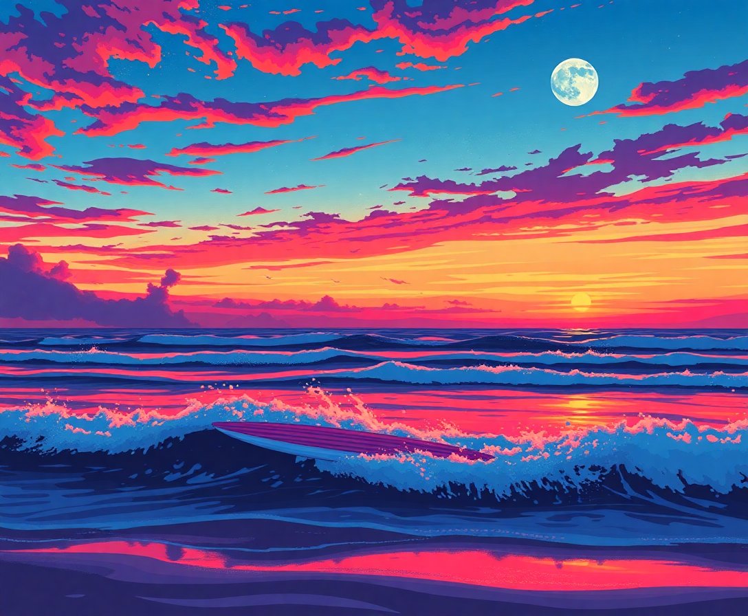 Subsequently, begin painting the numbered sections using the corresponding colors. Start with larger areas before moving to intricate details. Watch as the vintage portable TV and twilight surfer silhouettes emerge beautifully on your canvas.