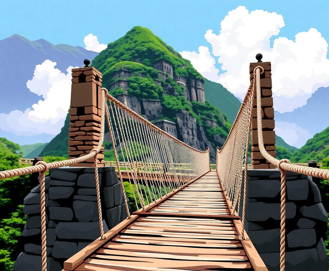 Begin your artistic adventure today with this captivating rope bridge scene. Create lasting memories while developing your painting skills through this engaging Andean mountain artwork.