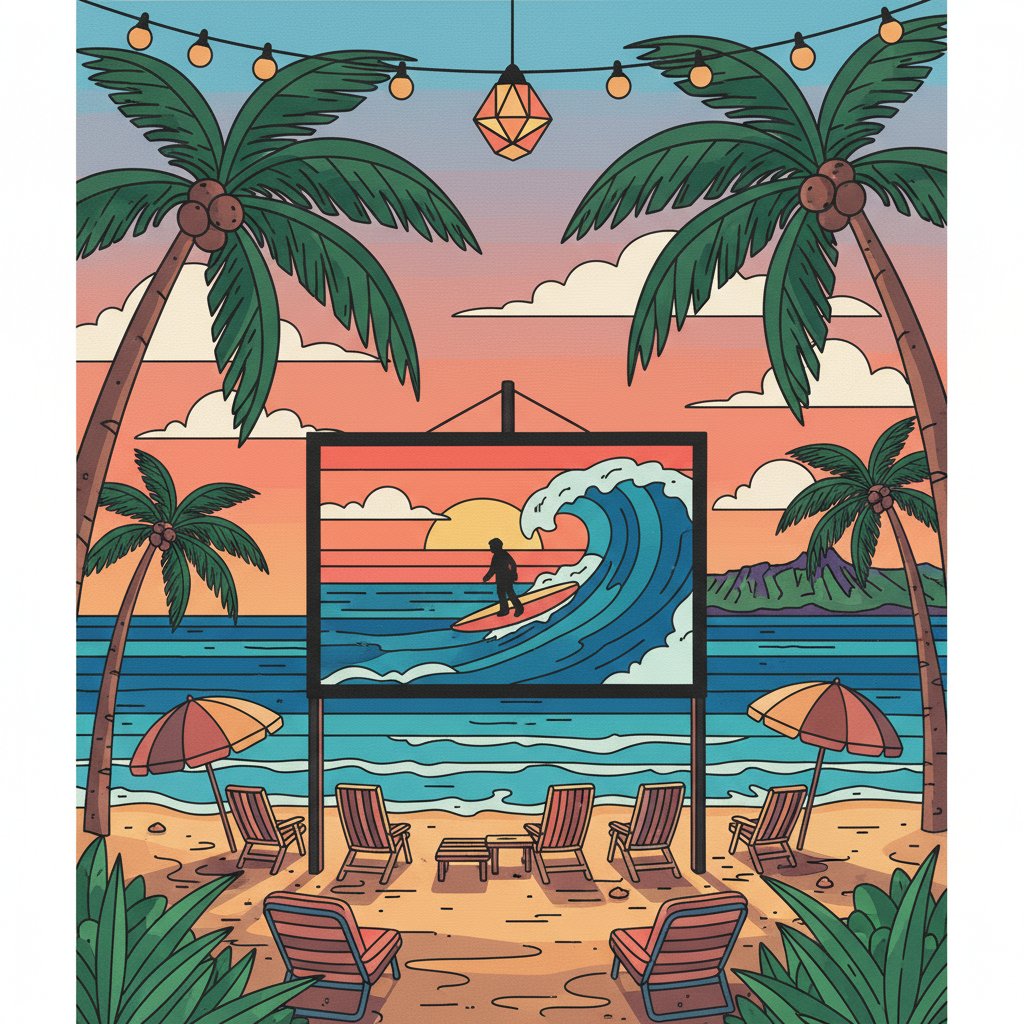 Transform your creative space with the captivating Vintage Waikiki Beach Cinema Paint By Numbers masterpiece. This nostalgic design captures the golden era of outdoor movie screenings against Hawaii’s stunning coastline. Experience the magic of vintage cinema culture through this therapeutic artistic journey.