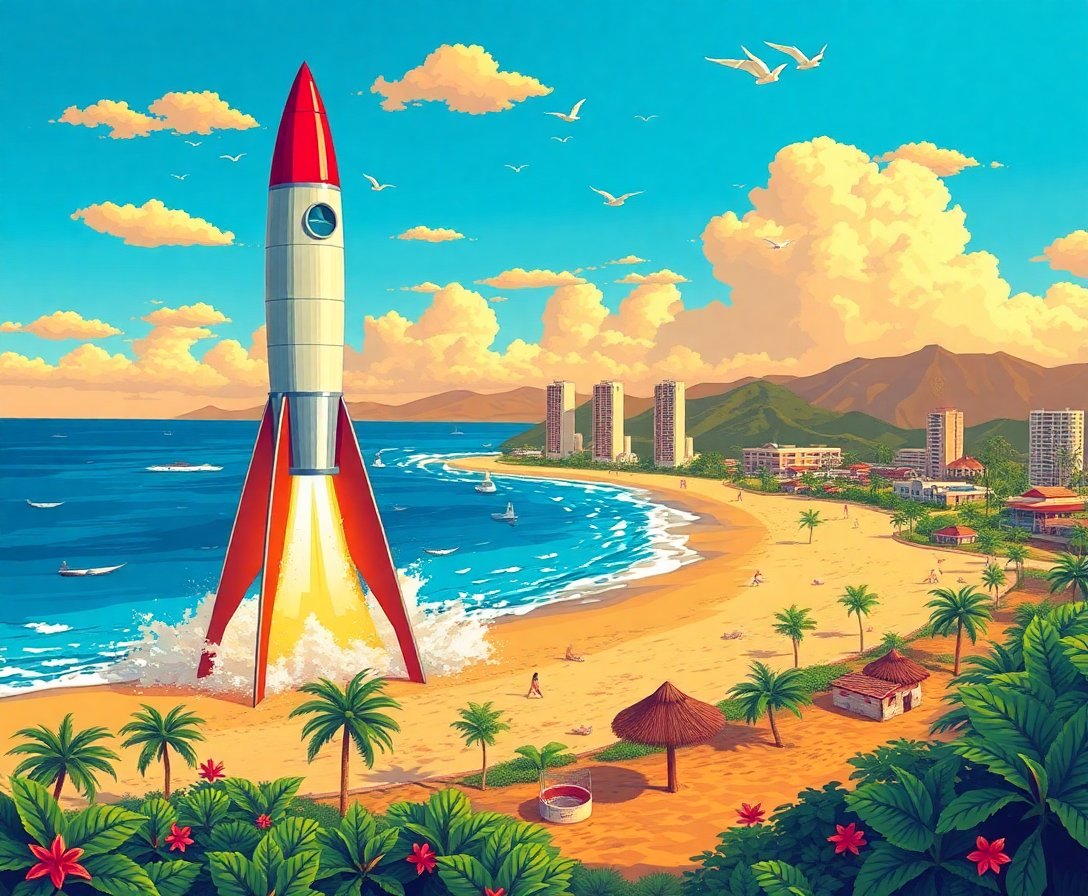 Step into a retro-futuristic paradise with this captivating Vintage Waikiki Rocket Landing Paint By Numbers masterpiece. This unique kit combines golden era comic aesthetics with tropical ocean vibes. Transform your space with vintage pulp art charm.
