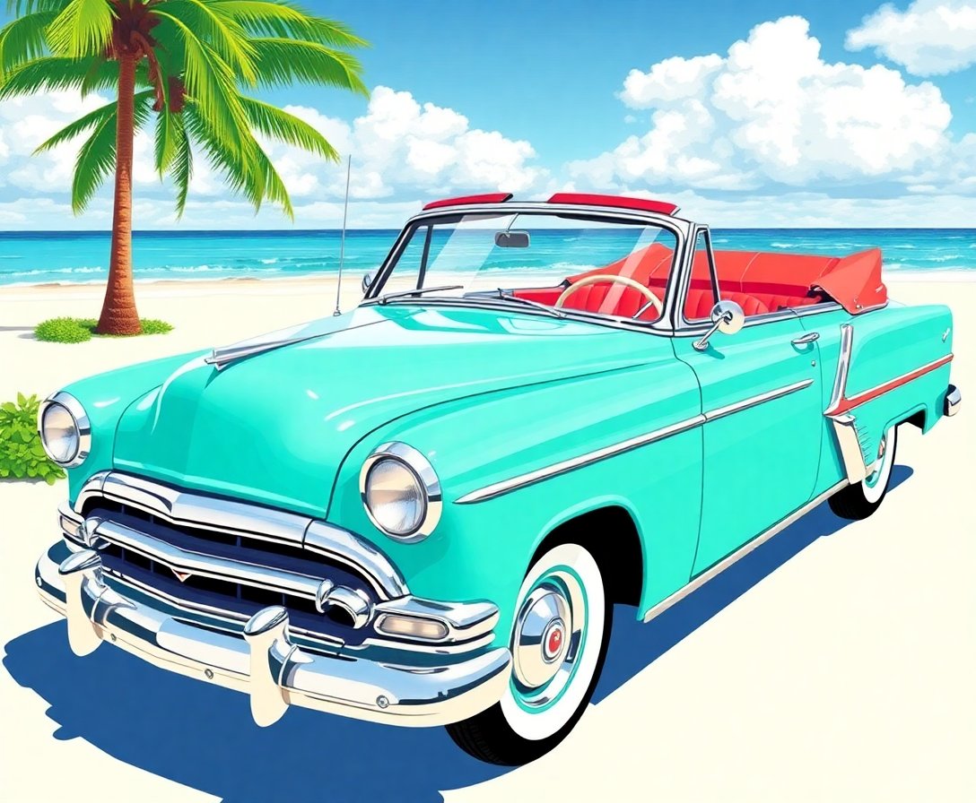 Begin your creative journey today with this enchanting Vintage Waikiki Turquoise Convertible Paint By Numbers kit. Subsequently, you’ll possess a stunning piece that captures the carefree spirit of vintage Hawaiian culture.