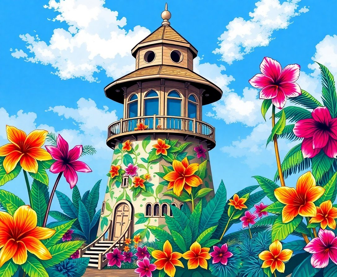 Ultimately, complete the finest details using the small brush for precision work. Therefore, step back periodically to admire your progress. Finally, your romantic watchtower surrounded by tropical blooms emerges as a stunning masterpiece.
