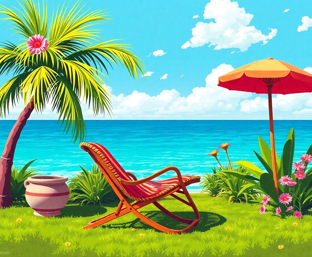 Ultimately, step back and admire your finished masterpiece with pride. Additionally, the tropical elements blend seamlessly with the retro chair design. Moreover, your completed artwork showcases authentic pop art styling perfectly. Therefore, display your creation prominently to share this nostalgic beauty.