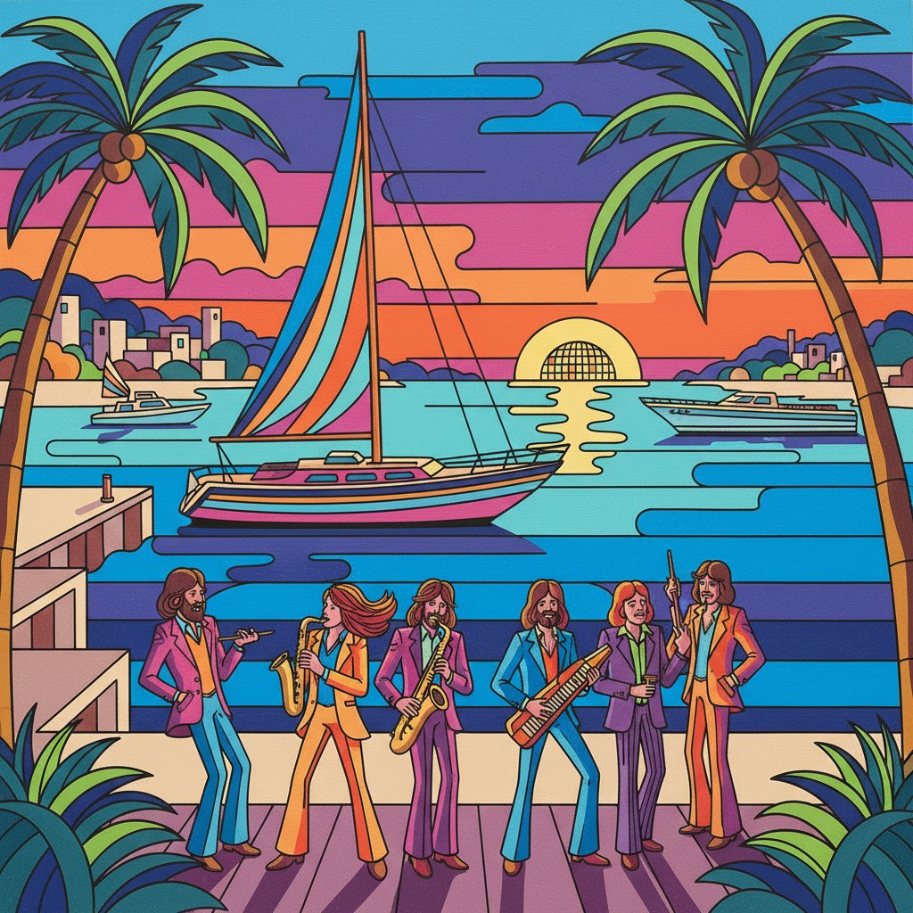 This design captures the smooth, sophisticated essence of 70s-80s yacht rock culture with authentic harbor imagery. The retro poster styling creates a unique tribute to this beloved musical era.
