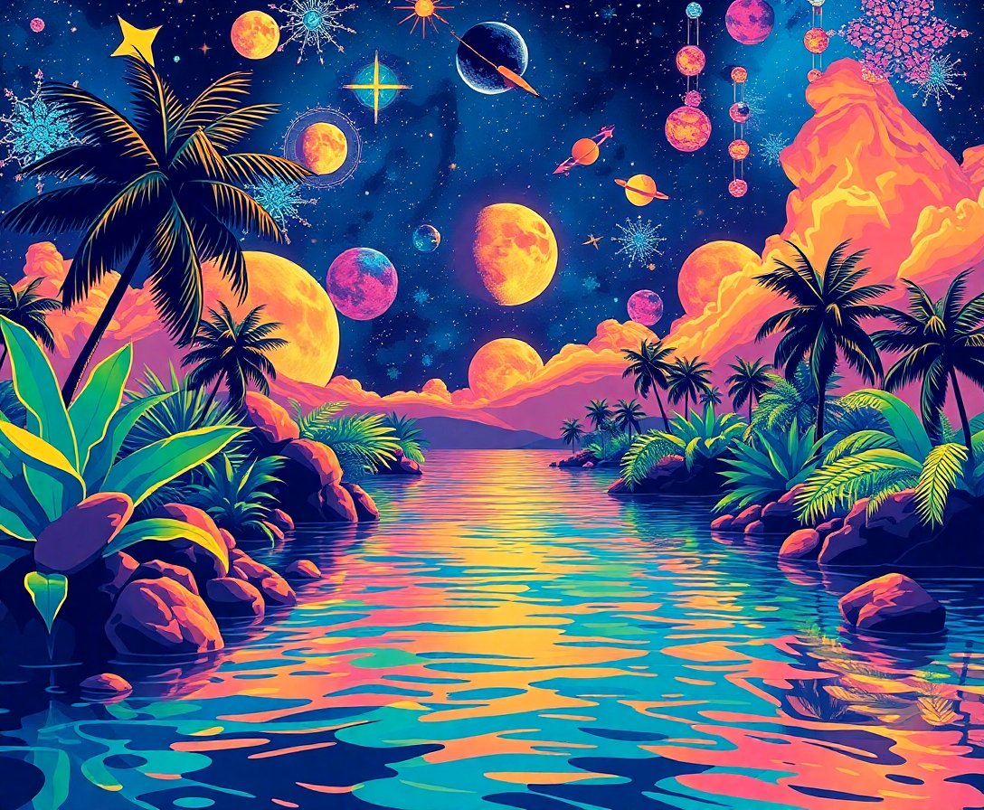 This unique artwork combines celestial elements with tropical paradise themes. The magical lagoon setting creates a dreamy, otherworldly atmosphere perfect for any space.