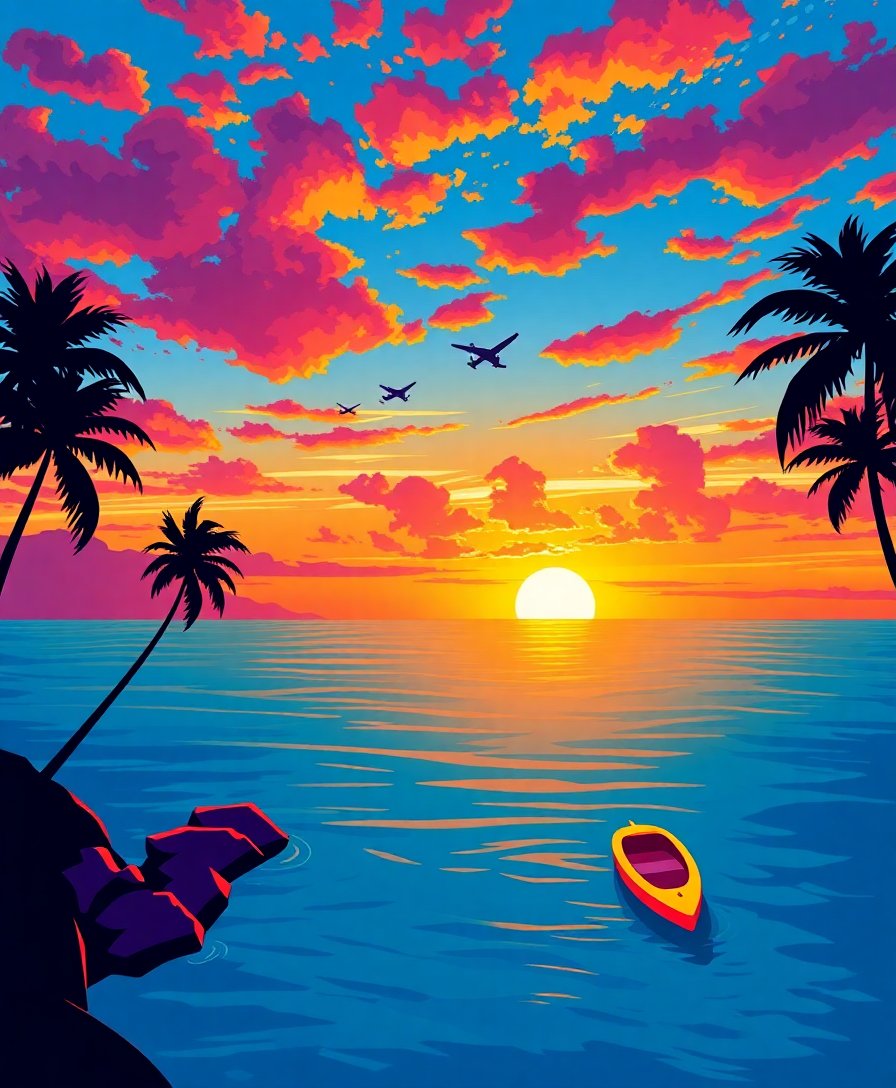 This tropical artwork combines relaxation with creativity, making it perfect for both beginners and experienced painters. The stunning sunset palette creates an engaging challenge while delivering impressive results. Moreover, studying tropical landscapes enhances appreciation for nature’s beauty.