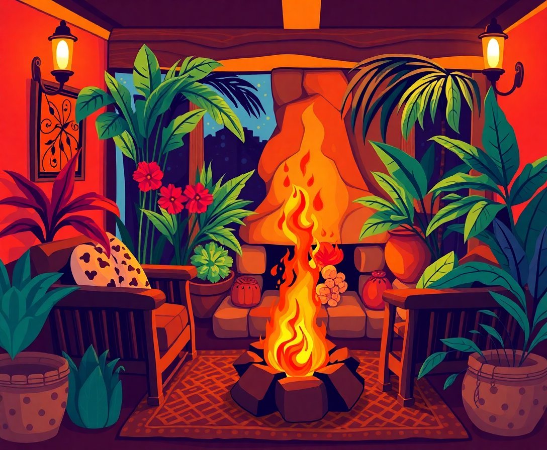 Transform your living space with the enchanting Warm Tropical Parlor Fire Paint By Numbers kit. This captivating design combines tropical warmth with vintage parlor elegance. Meanwhile, flickering flames cast gentle shadows across the intimate interior scene.