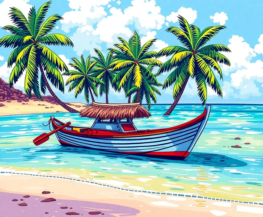 Transform your creative space with this stunning Weathered Tropical Island Skiff Paint By Numbers masterpiece. This captivating design features a rustic wooden boat nestled against crystal-clear turquoise waters. Moreover, every brushstroke brings you closer to capturing the essence of coastal tranquility.