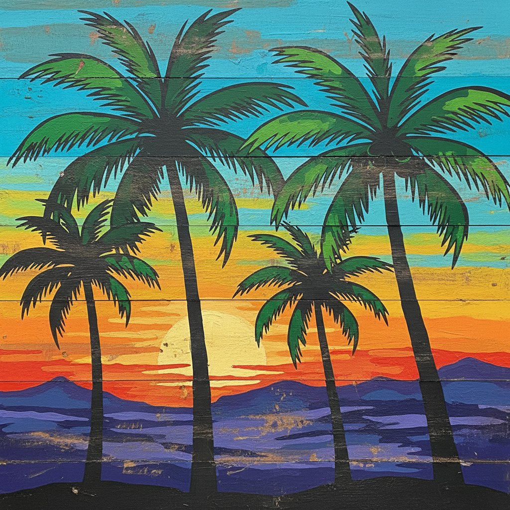 The high-quality linen canvas measures 16×20 inches, providing ample space to capture all the intricate details of the weathered wood and palm silhouettes design.