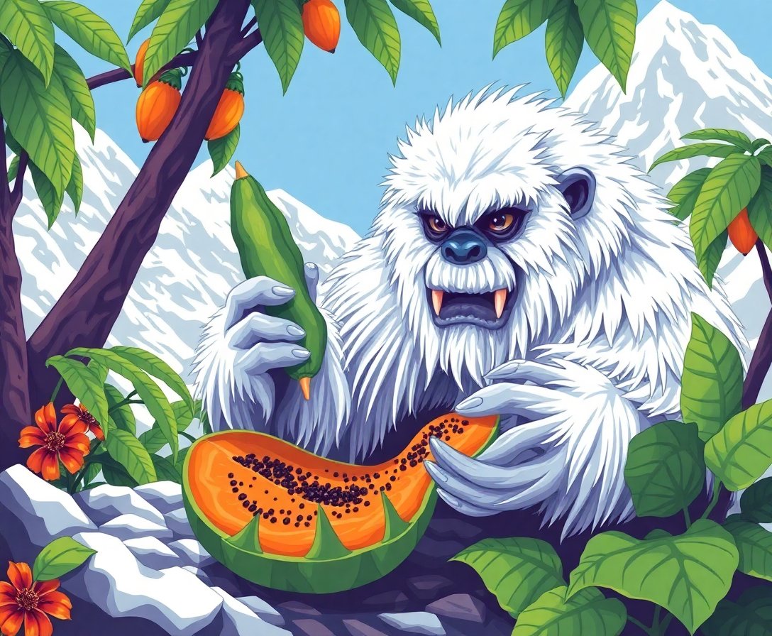 Discover the enchanting world where mythology meets tropical paradise with the Yeti Finds Tropical Papaya Paint By Numbers. This captivating artwork depicts a majestic Himalayan yeti discovering vibrant tropical papayas, creating a stunning contrast between mythical wilderness and exotic fruit paradise.